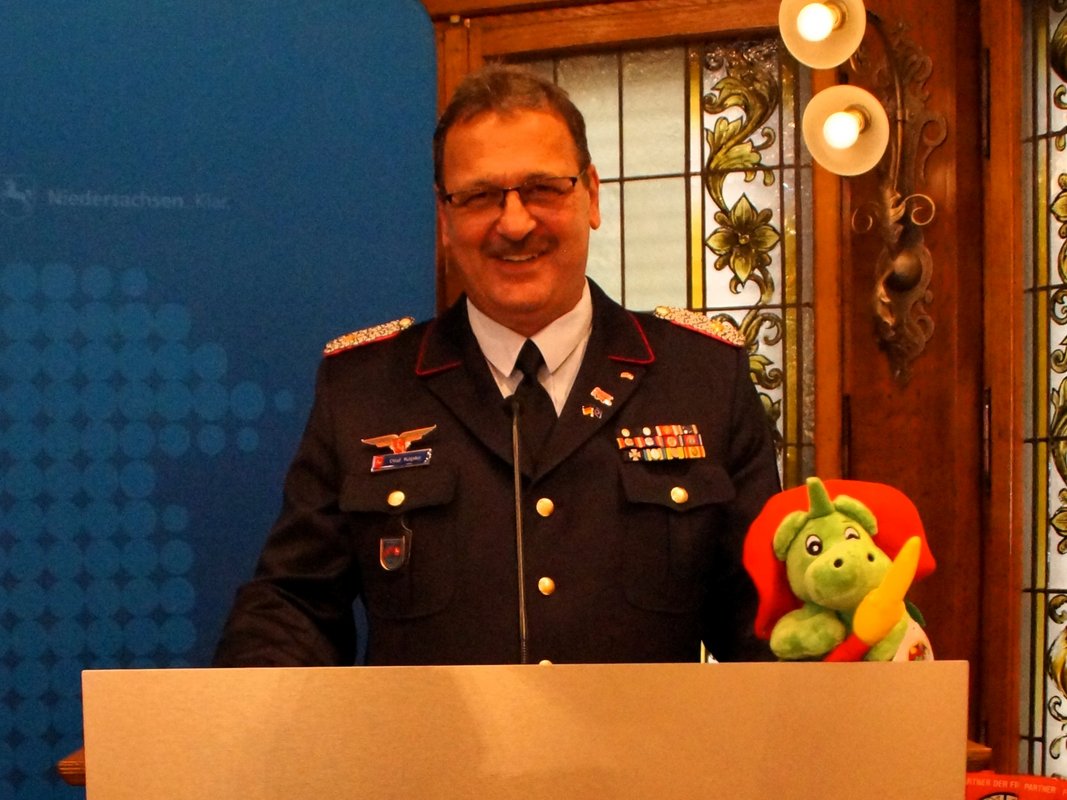 Der LFV-Präsident Olaf Kapke dankte den ausgezeichneten Firmenvertretenden für ihr „unbezahlbares“ Engagement zum Wohle und zum Erhalt der Freiwilligen Feuerwehren vor Ort in Niedersachsen. „Sei es mit Geld- oder Sachspenden, sei es mit der Zurverfügungstellung von Örtlichkeiten zum Üben für den Ernstfall oder bei der Durchführung von Zeltlagern der Kinder- und Jugendfeuerwehren. Die Bandbreite der Hilfsbereitschaft der einzelnen Unternehmungen ist sehr groß und unverzichtbar“, so Olaf Kapke. Weiter dankte Niedersachsens Feuerwehrpräsident allen Anwesenden dafür, dass nur durch „Ihre Arbeit und Hilfsbereitschaft“ das ehrenamtliche System des Brandschutzes so aufrechterhalten und weiter den aktuellen Herausforderungen angepasst werden kann!