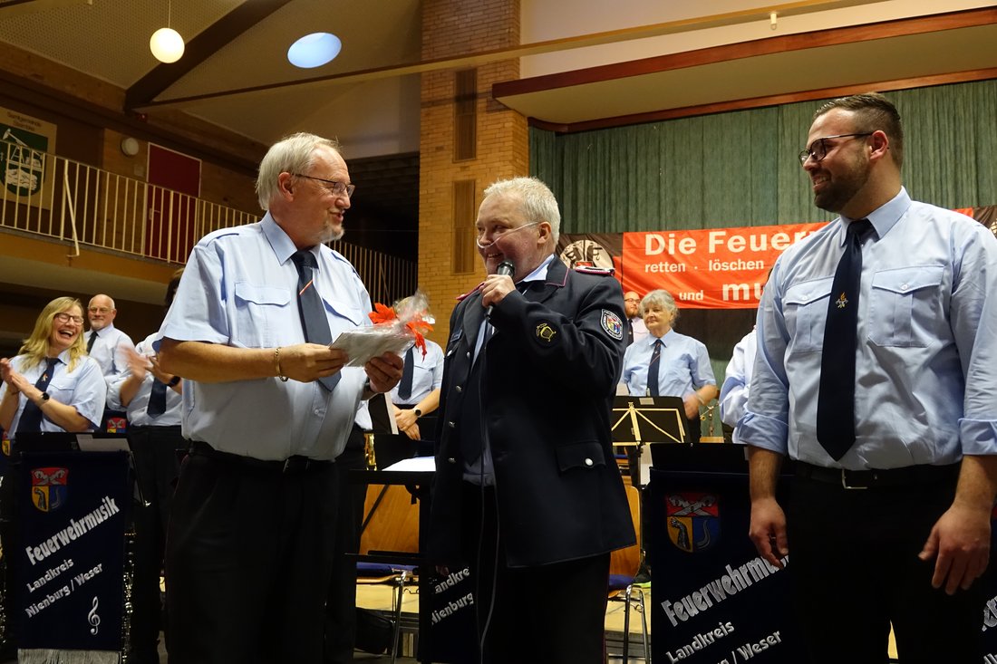 Der Spitzenmusiker und Dirigent Peter Jenal hatte den Spielleuten im Alter von 14 bis 84 Jahren im Workshop in Landesbergen den letzten Schliff verpasst und einige Musikstücke eingeübt. Peter Jenal hat zehn Jahre in der Big Band der Bundeswehr und im Heeresmusikkorps Münster musiziert und ist immer noch aktiv bei den Egerländer Musikanten. Der Saarländer sparte nicht mit Lob für das Feuerwehrorchester, das er mittlerweile zum sechsten Mal durch das Konzert führte.