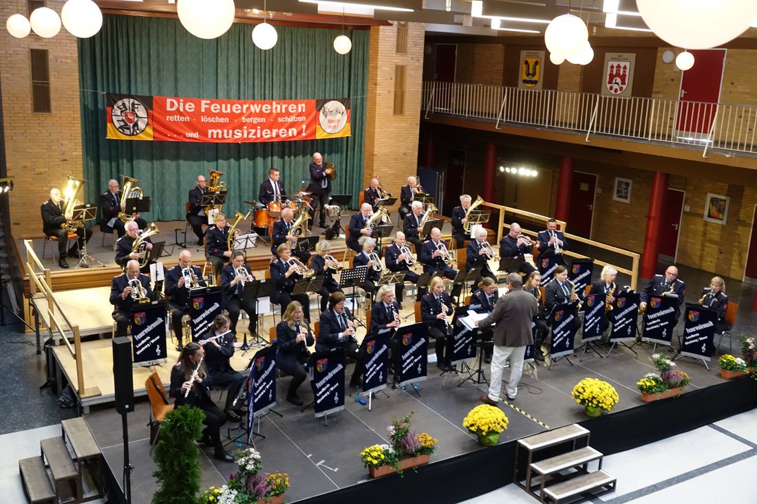 Nienburg (LK Nienburg): Punkt 15.00 Uhr ertönten in der vollbesetzten Aula der Berufsbildenden Schule in Nienburg Trompetenfanfaren (Sirenen) zur Eröffnung des diesjährigen Konzerts des Feuerwehrmusikzug der Kreisfeuerwehr Nienburg unter dem Motto „So schön ist Blasmusik“. Moderator Julian Kohr begrüßte die zahlreich erschienen Besucherinnen und Besucher, sowie als Gäste Bezirksstabführer Rüdiger Finze, die Stabführerin der Stadt Hannover, Silvia Dahners, Landrat Detlev Kohlmeier und Brandabschnittleiter Süd Ralf Tiedemann. In einem Workshop hatten sich 38 Feuerwehrmusikerinnen und Musiker aus 12 Musikzügen von Freitagabend bis Sonntagmittag auf das Event intensiv vorbereitet. Einige Musikanten kamen aus den Landkreisen Diepholz, Schaumburg, Heidekreis und Verden. Auch die Zwillinge Dirk und Nils Rix aus der Nähe von Kiel sind mittlerweile fester Bestandteil des Orchesters.