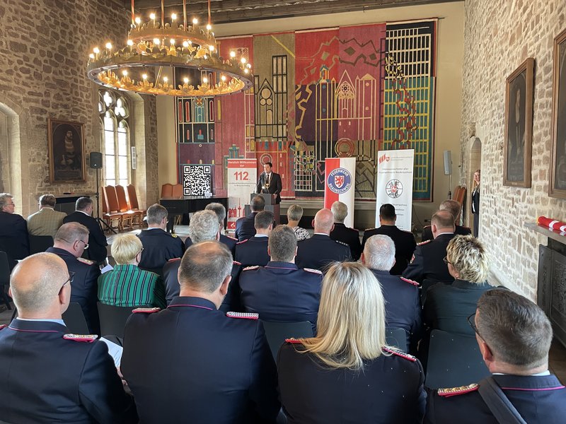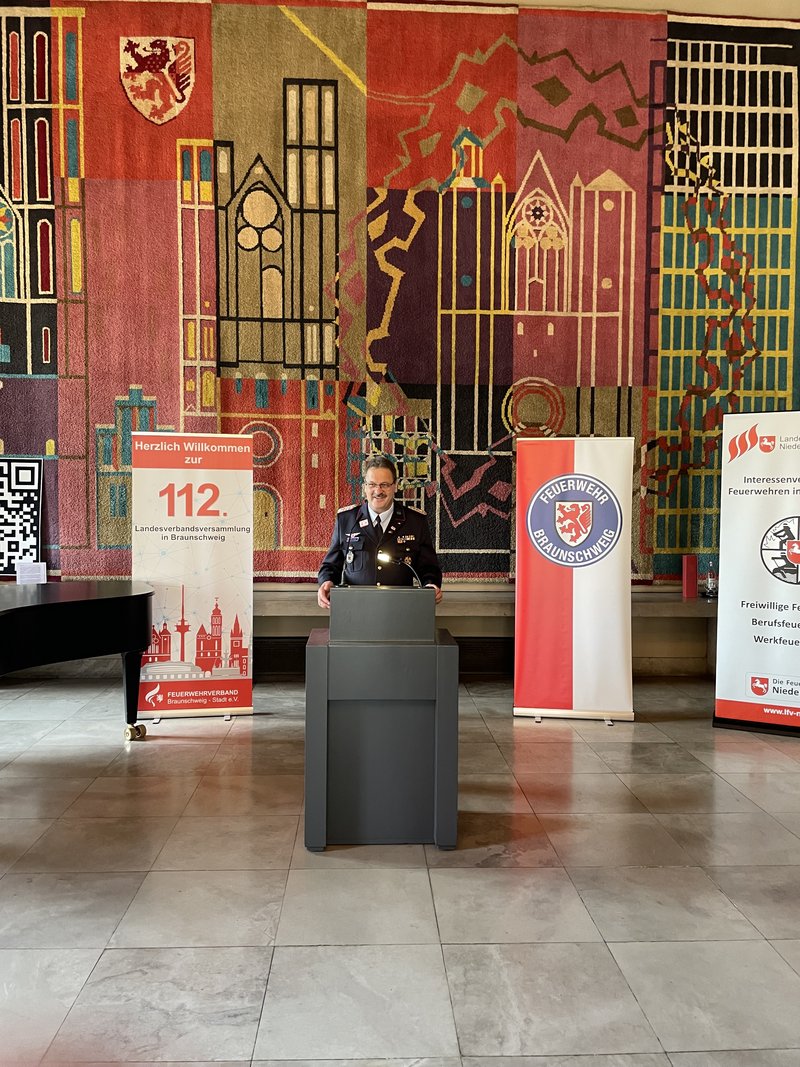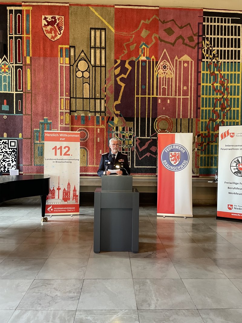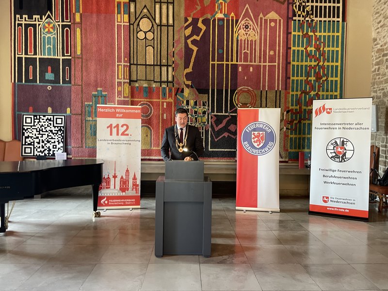 Um 11:00 Uhr begrüßte Braunschweigs Oberbürgermeister Dr. Thorsten Kornblum zahlreiche Vorstandsmitglieder des LFV-NDS und des Stadtfeuerwehrverbandes (StFV) Braunschweig sowie weitere Gäste in der Dornse im Altstadtrathaus. Er freute sich in seiner Ansprache, dass der LFV-NDS seine 112. Landesverbandsversammlung (LVV) in Braunschweig in Zusammenarbeit mit dem hiesigen Stadtfeuerwehrverband durchführe.