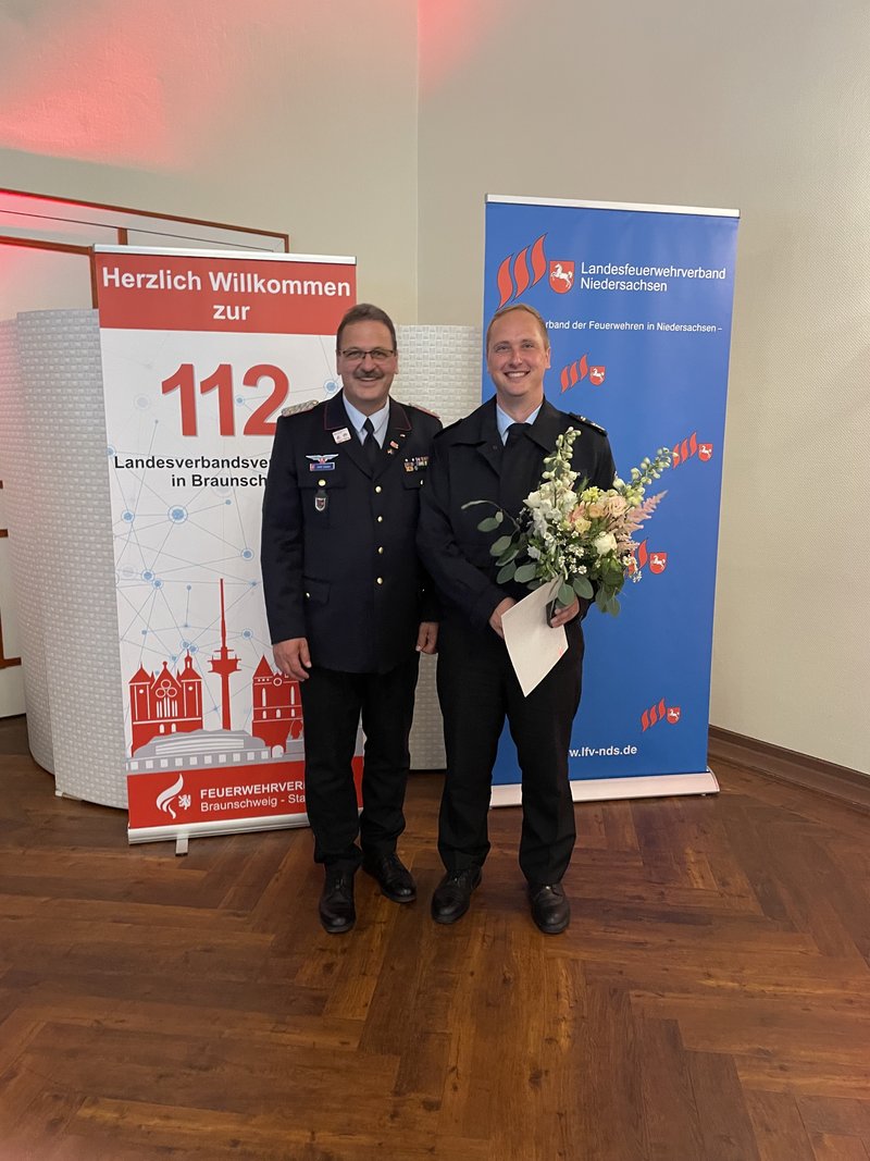 Als Erinnerung an diese 112. LVV überreichte Olaf Kapke dem Vorsitzenden des Stadtfeuerwehrverbandes Braunschweig, Ingo Schönbach, eine Fahne des LFV-NDS.