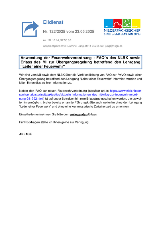 am 23. Mai 2025 hat die Abteilung 7 des Niedersächsischen Ministeriums für Inneres, Sport und Digitalisierung eine Übergangsregelung zum Umgang mit dem Lehrgang „Leiter einer Feuerwehr“ für die ordnungsgemäße Übertragung einer Regelfunktion für ehrenamtliche Führungskräfte nach §§ 20-22 des NBrandSchG veröffentlicht.