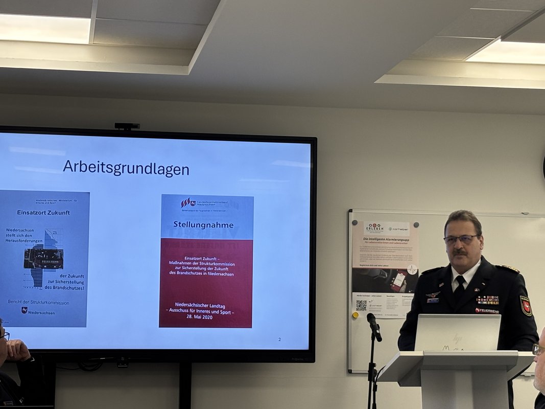 LFV-Präsident Olaf Kapke stellte anschließend in einer Präsentation die Schwerpunkte zur Stärkung des Ehrenamtes vor. Dazu zählten unter anderem die Vereinbarkeit von Feuerwehrdienst, Familie, Beruf und Pflege, die Nachwuchsgewinnung, die Entwicklung von Führungskräften, Gleichstellung, Inklusion und Integration sowie Themen wie Feuerwehrrente, Jubiläums- und Anerkennungszuwendungen und die Akzeptanz des Ehrenamtes bei Arbeitgebern.