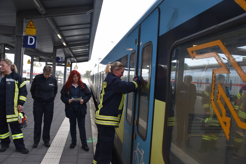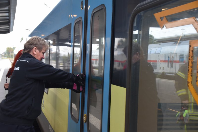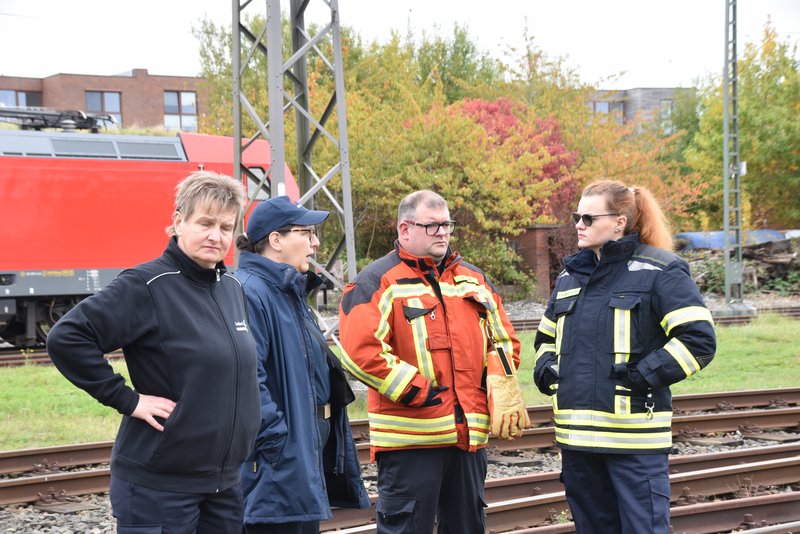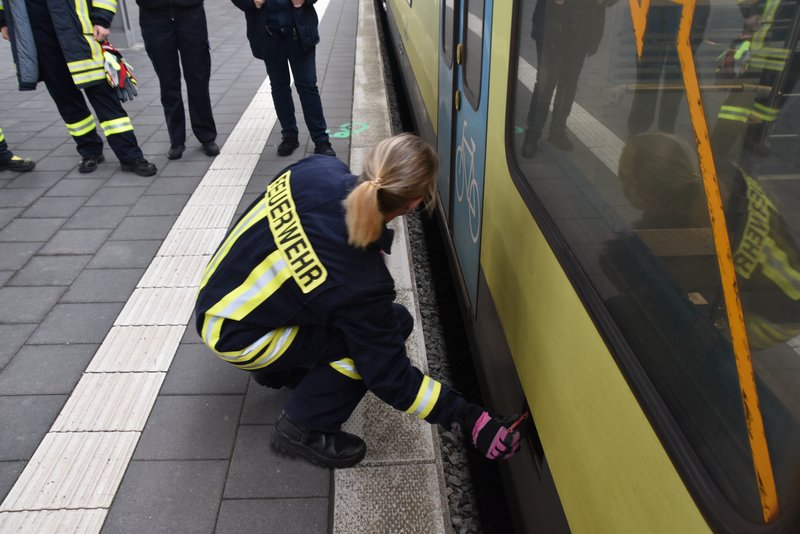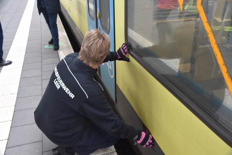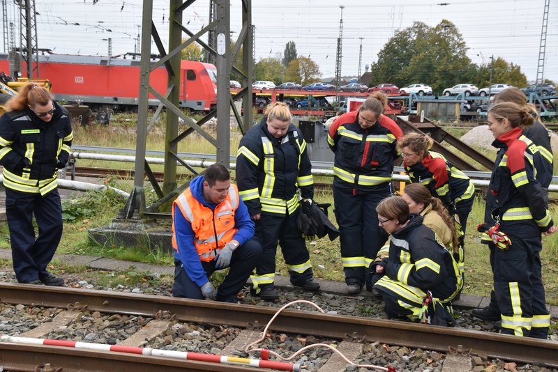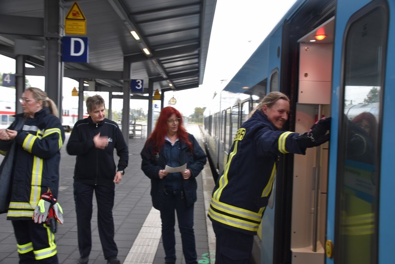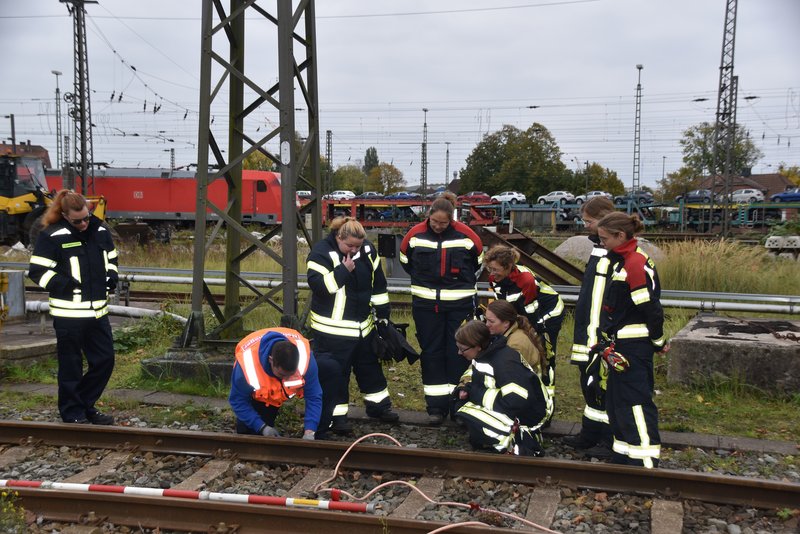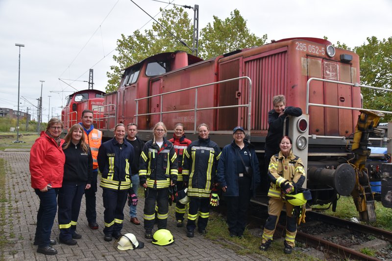 Ein besonders praxisnaher Workshop, der am Emder Bahnhof stattfand. Die Notfallmanager der Deutschen Bahn (Stefan Halm und Marcel Marquardt) erläuterten Gefahren des Bahnbetriebs und erklärte Sicherungsmaßnahmen (bei Arbeiten an den Gleisen oder der Oberleitung werden die Bereiche geerdet, um Restspannung zu beseitigen und Sicherheit zu gewährleisten). Weiter durften die Feuerwehrfrauen das Stellwerk in Emden besichtigen, Herr Halm erklärte den Frauen welche Aufgaben die Mitarbeiter haben und wie ein Stellwerk funktioniert. Im Anschluss wurde ein Übungsszenario an einem Zug der Westfalenbahn durchgeführt, hier wurde gezeigt wie man die Türen von aussen über ein Türnotöffnungssystem öffnet. - Technische Hilfeleistung – Einsatzmöglichkeiten mit verschiedenen Rettungsgeräten