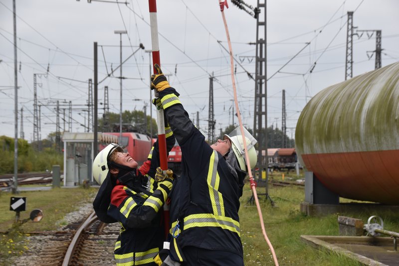 Hier ging es um die Grundlagen der Eigensicherung: Halten mit Feuerwehrleine, Selbstsicherung mit Feuerwehrhaltegurt und verschiedene Sicherungstechniken wurden in Theorie und Praxis geübt. - Hilfeleistungseinsätze im Gleisbereich