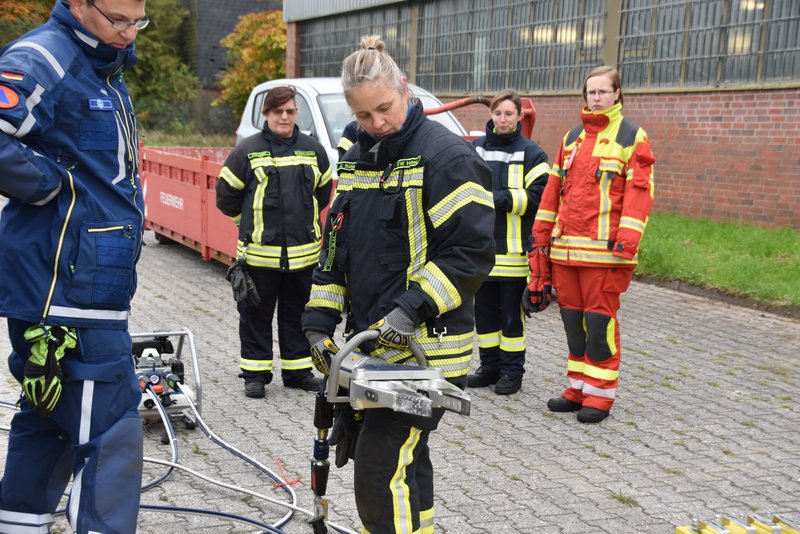 Hier stand die Praxis im Vordergrund. Die Kameradinnen arbeiteten mit hydraulischen Rettungsgeräten, übten den Umgang mit Schere und Spreizer und simulierten den Einsatz bei Verkehrsunfällen. - Gefahrgut / CBRN-Messkonzept Ostfriesland