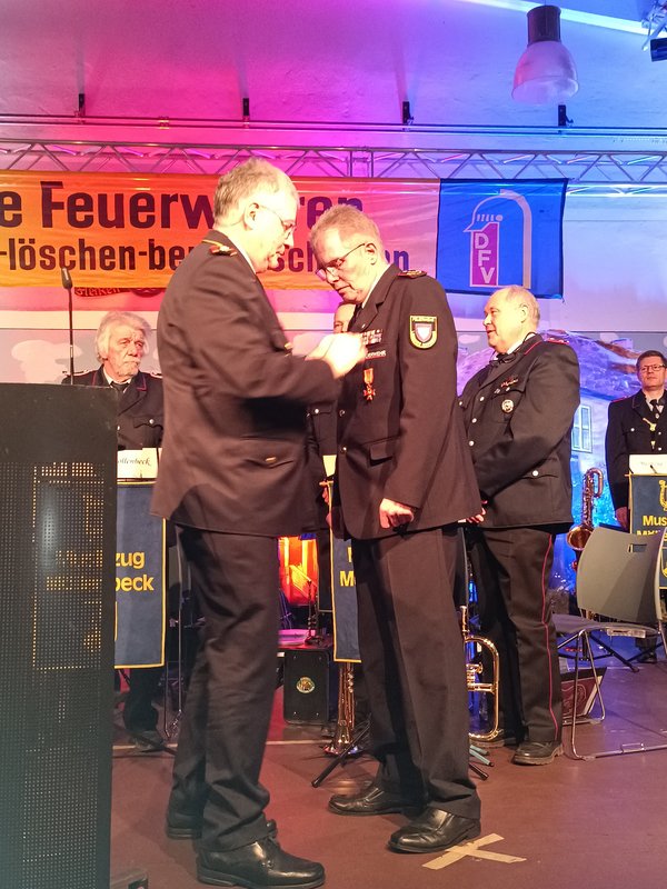 Karl-Heinz Banse lobte Grotes Engagement: "Du spielst eine sehr, sehr starke Rolle bei den Feuerwehren. Du bist kein stiller Beisitzer gewesen. Ein besonderer Dank gilt auch Bärbel und Deiner Familie." Banse zeichnete Grote mit der goldenen Ehrennadel des Deutschen Feuerwehrverbandes aus.