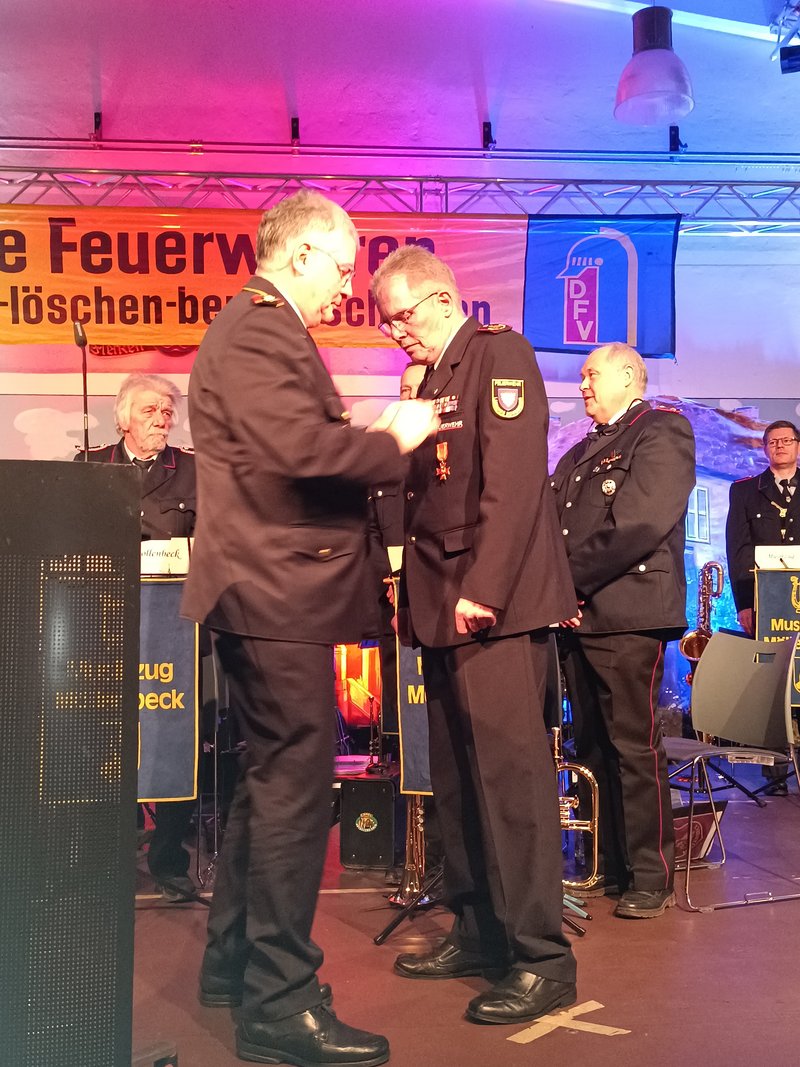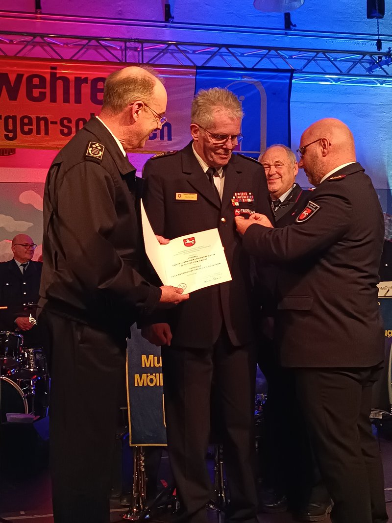 Rohrberg und Regierungsbrandmeister Dascho Wehner zeichneten Grote mit dem Niedersächsischen Feuerwehr-Ehrenzeichen am Bande in Gold aus. "Diese Ehrung wird nur für besonders herausragende Dienste verliehen." so Rohrberg.