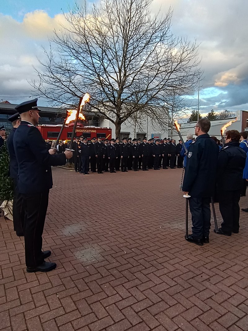 In Lauenau haben sich zwischenzeitlich die Führungskräfte der Ortsfeuerwehren sowie die Stadt- und Gemeindebrandmeister zur Ehrenformation für den großen Zapfenstreich versammelt.
