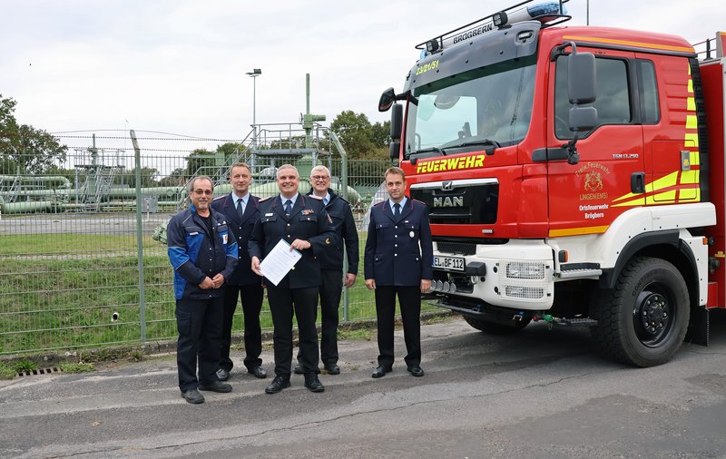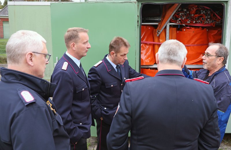 Für die Unterzeichnung der Grundsatzvereinbarung trafen sich Moshos Michailidis (Fa. Nord West Ölleitung GmbH), Holger Dyckhoff (Kreisbrandmeister), Hans-Bernd Ahlers (Brandabschnittsleiter Nord) sowie von der Feuerwehr Brögbern der Ortbrandmeister Stefan Behlmann und sein Vertreter Stefan Könning beim Ölwehrdepot in Brögbern.