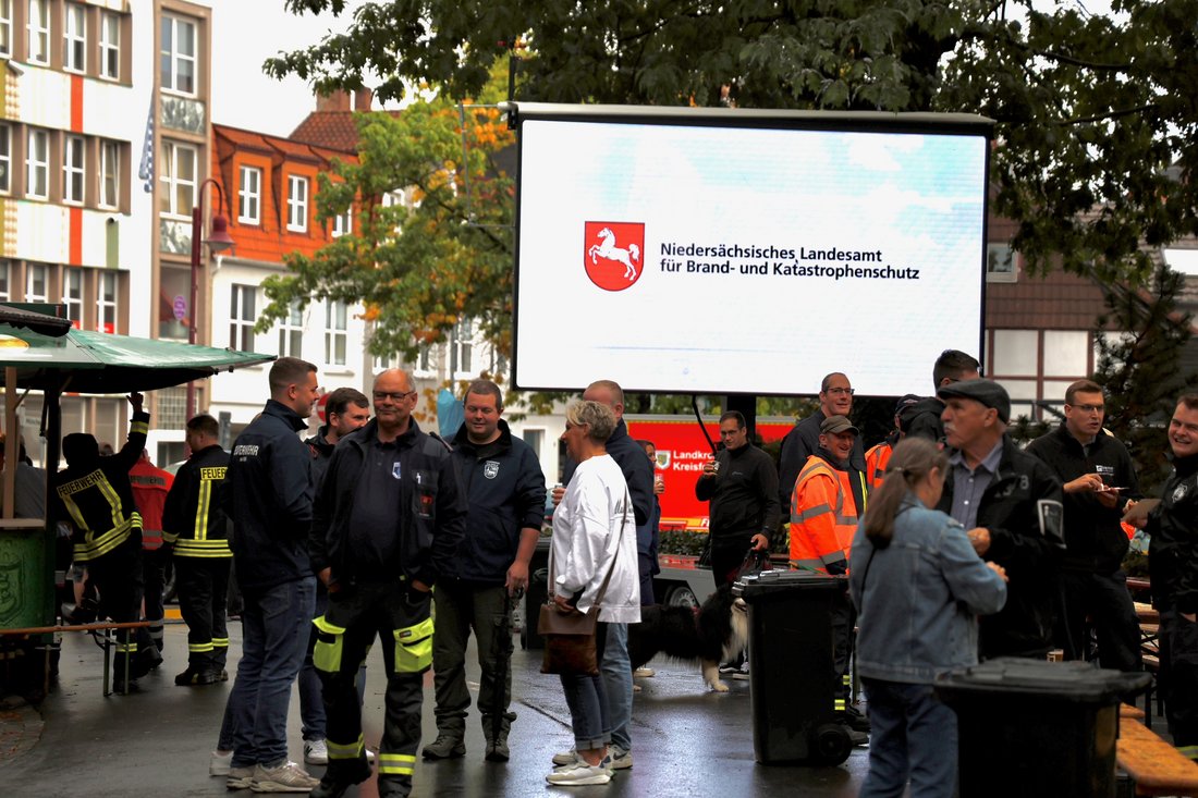 Das Wetter zeigte sich wechselhaft: Am Vormittag schien zunächst die Sonne, später sorgte Regen für nasse Wettkampfbahnen. Weder die Stimmung der Mannschaften noch die Begeisterung der Zuschauer konnte das trüben. Hunderte Gäste säumten die Innenstadt, feuerten die Teams an – und erlebten bei Kaffee und Kuchen in den vielen gastronomischen Betrieben am Markt- und Möncheplatz Feuerwehrsport hautnah. Ein besonderes Highlight: Das Wettbewerbsgeschehen wurde live auf eine Großleinwand am Möncheplatz übertragen. Möglich machte dies die Zusammenarbeit des Landkreises Northeim mit dem Niedersächsischen Landesamt für Brand- und Katastrophenschutz in Sachen satellitengestützte Liveübertragung, die bereits bei der länderübergreifenden Waldbrandübung „Eichkater“ erfolgreich erprobt worden war.